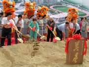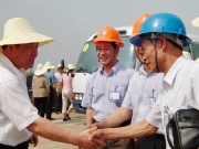 2011年時任副市長鄧偉根(中)、禪城區(qū)建設(shè)局局長國興華(左)在董事長朱志山(右)在佛山二中宿舍樓工地現(xiàn)場