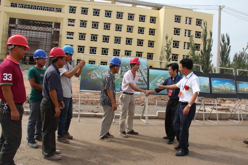 2012年4月22日,省委副書(shū)記、省長(zhǎng)朱小丹率廣東代表團(tuán)考察廣東對(duì)口支援新疆喀什工作時(shí)與六建援建人員陳偉斌親切握手