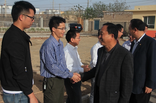 2012年4月20日時(shí)任佛山市副市長(zhǎng)冼瑞倫在伽師縣縣委書(shū)記朱雪冰陪同下視察援疆干部生活情況并和六建援建人員陳偉斌握手